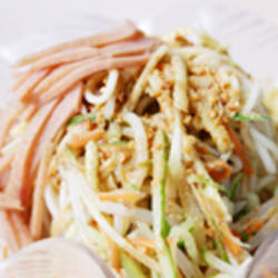 店裡的特製麻醬有區分為三種,第一種一般傳統涼麵麻醬主要是以現磨黑白芝麻麻醬、醬油、糖水、蒜泥、醋等多種配料調製而成,其中麻醬加以特製的調理,才能散發甘醇的口感,濃稠的麻醬佐以酸甜的味道,吃起來特別爽口。第二種日式柴魚醬汁,採用昆布、柴魚、香菇等食材,用慢火熬煮兩個小時而成,且絕無添加防腐劑,純天然食材。第三種泰式醬汁是用魚露、檸檬汁、雞辣醬調製成酸酸辣辣的口感,讓人吃了還想多吃幾口。
