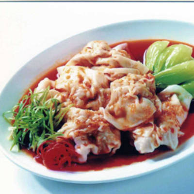抄手的麵皮是以 12 x 12 cm的大張皮製做口感滑溜帶Q,內餡佐以新鮮火燒蝦,清爽不油膩,是道每來必點的佳餚!!!