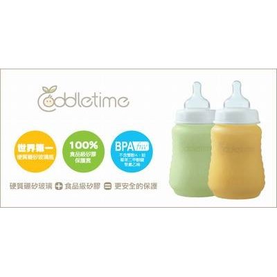 Coddletime的奶瓶是由玻璃瓶和矽膠外層所製成,具功能性也易於使用。除了有防滑,重量輕和耐高溫等特性外,奶瓶表面更不易刮傷。我們的奶瓶沒有多餘的部分,卻可以有其他奶瓶一樣的功能,能排出多餘的氣體和防止寶寶腹部絞痛。奶瓶也很容易清洗,可用洗碗機和消毒器清洗消毒,也可於微波爐。所有Coddletime的產品和包裝都是100%無毒。