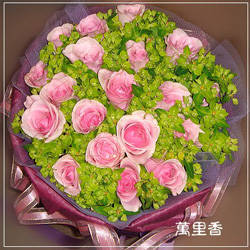 使用花材-粉玫17朵加黃河小花+高級緞帶+包裝紙