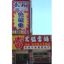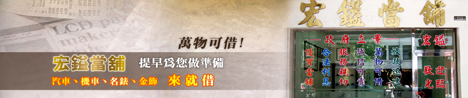 宏鎰當舖服務項目: 1.汽機車借款:不分新、舊車;分期車;貸款車,皆可(當)借款。 2.三點半預借 3.降息代償 4.工商業週轉:企業週轉、公司週轉、工廠借款機械設備融資。 5.各物品質借:電子3C商品、名牌包、黃金鑽石質借、名牌手錶。 6.高價收購舊金:飾金、金幣、條塊…等。 7.代辦房屋貸款