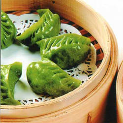 專為喜愛氫清淡養生的顧客計算。內餡是青江菜、冬粉、香菇,小蝦米。麵皮以菠菜原汁調色,含有豐富的蔬菜營養,小蝦米及香菇的香氣,使人齒頰留香。