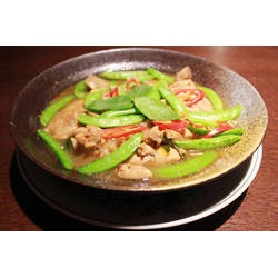 香氣四溢的剝皮辣椒雞工序相當繁雜,整體是以紹興酒和蠔油來做調味,烹飪過後還須經過浸泡以及撈油,如此一來配色鮮艷又美味的剝皮辣椒雞才會呈現在客人的桌前。雞肉的口感鮮嫩多汁,豆莢則是保有原本的脆度和鮮甜味,且因為有紹興酒和剝皮辣椒的提味,整體顯得清爽不油膩,相當下飯。