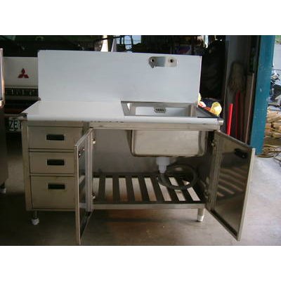 一水槽、平台(可選擇左右邊),下方三抽屜一櫥櫃(可選擇要平板式或棚架式),水龍頭自備或代裝都可以。歡迎來電洽詢!