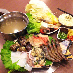 匯集花枝.鮮蝦.鮮蚵.蛤蠣.鮮魚的綜合海鮮鍋.湯頭奇鮮無比。